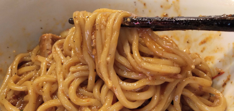 太麺は固めをオーダーすることができないので、少し柔らかい印象がありますね。