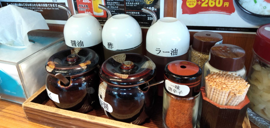 テーブルにあるお酢とラー油を3周づつ掛ければ、とりあえずはそれでOKです。
